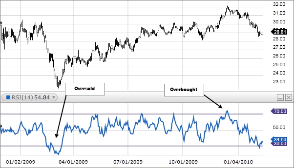 Relative Strength Index (RSI): plots the relative strength of the price compared to previous prices. Momentum indicator. Can't predict how the price will change in the future.